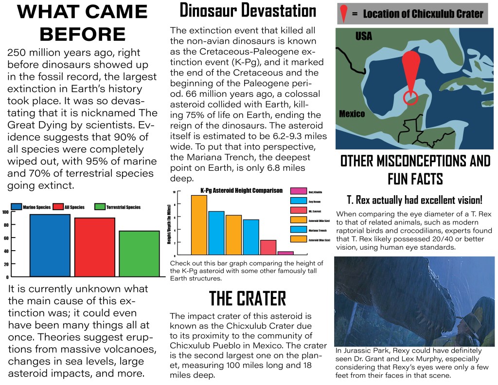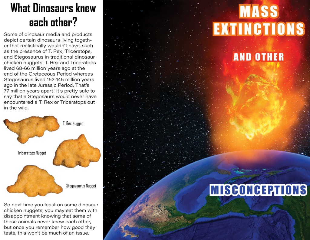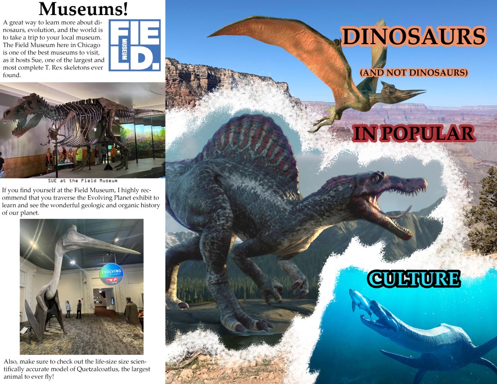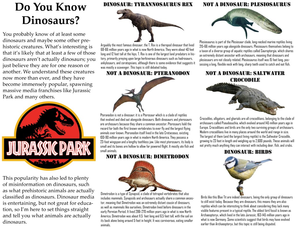 This is a project I’m currently working on in my Graphic Design class. We were tasked with creating a 6 page brochure that aims to educate a demographic of our choice. We had to create many things to meet the requirements, such as graphs, maps, image collages, and more. I decided to center my brochure around educating people on creatures commonly labeled as dinosaurs by the public when they are in fact not dinosaurs. I also included sections on extinction and plenty of other fun facts. The 6 pages below are in chronological order.